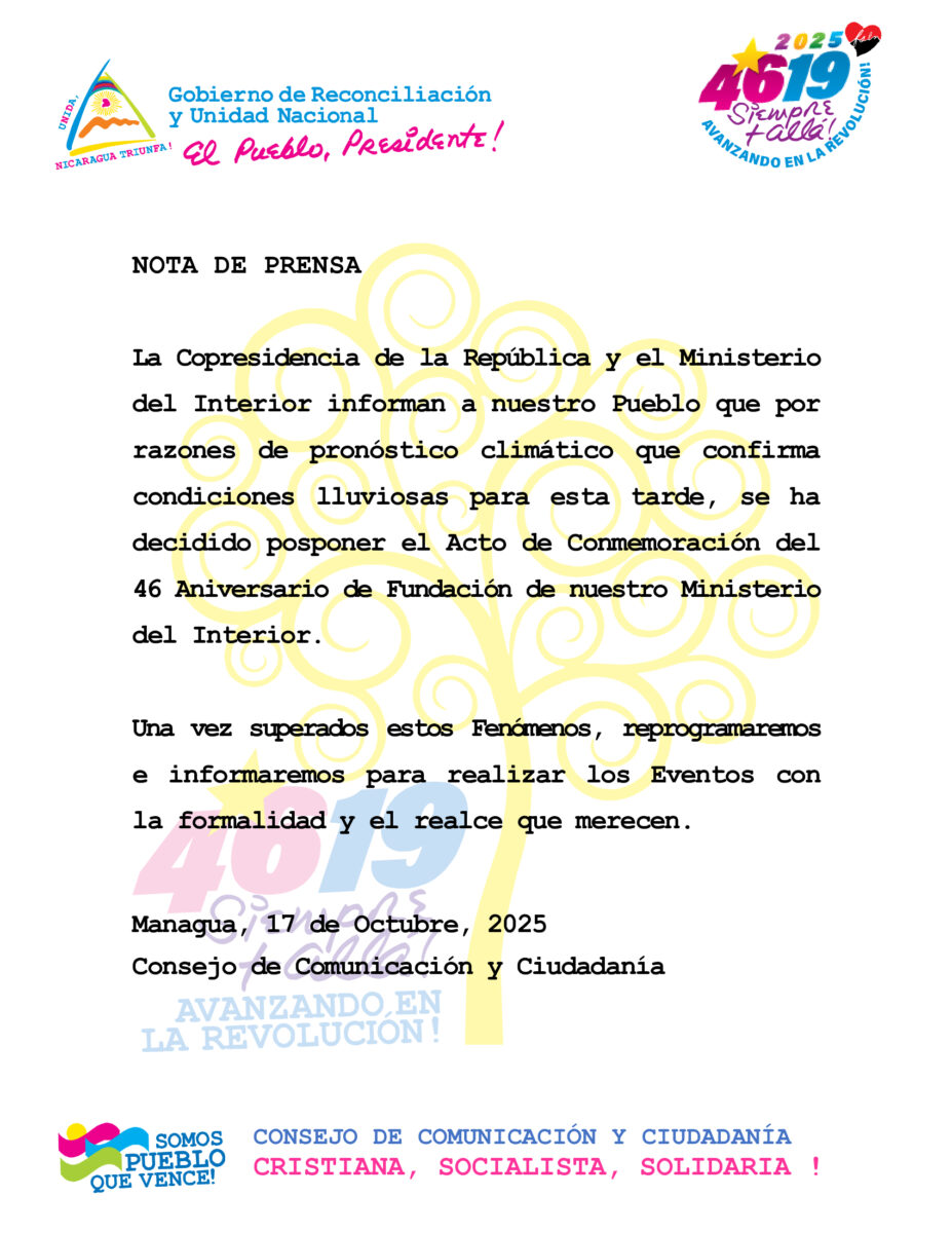 La Copresidencia de la República y el Ministerio del Interior informan a nuestro Pueblo que por razones de pronóstico climático que confirma condiciones lluviosas para esta tarde, se ha decidido posponer el Acto de Conmemoración del 46 Aniversario de Fundación de nuestro Ministerio del Interior.