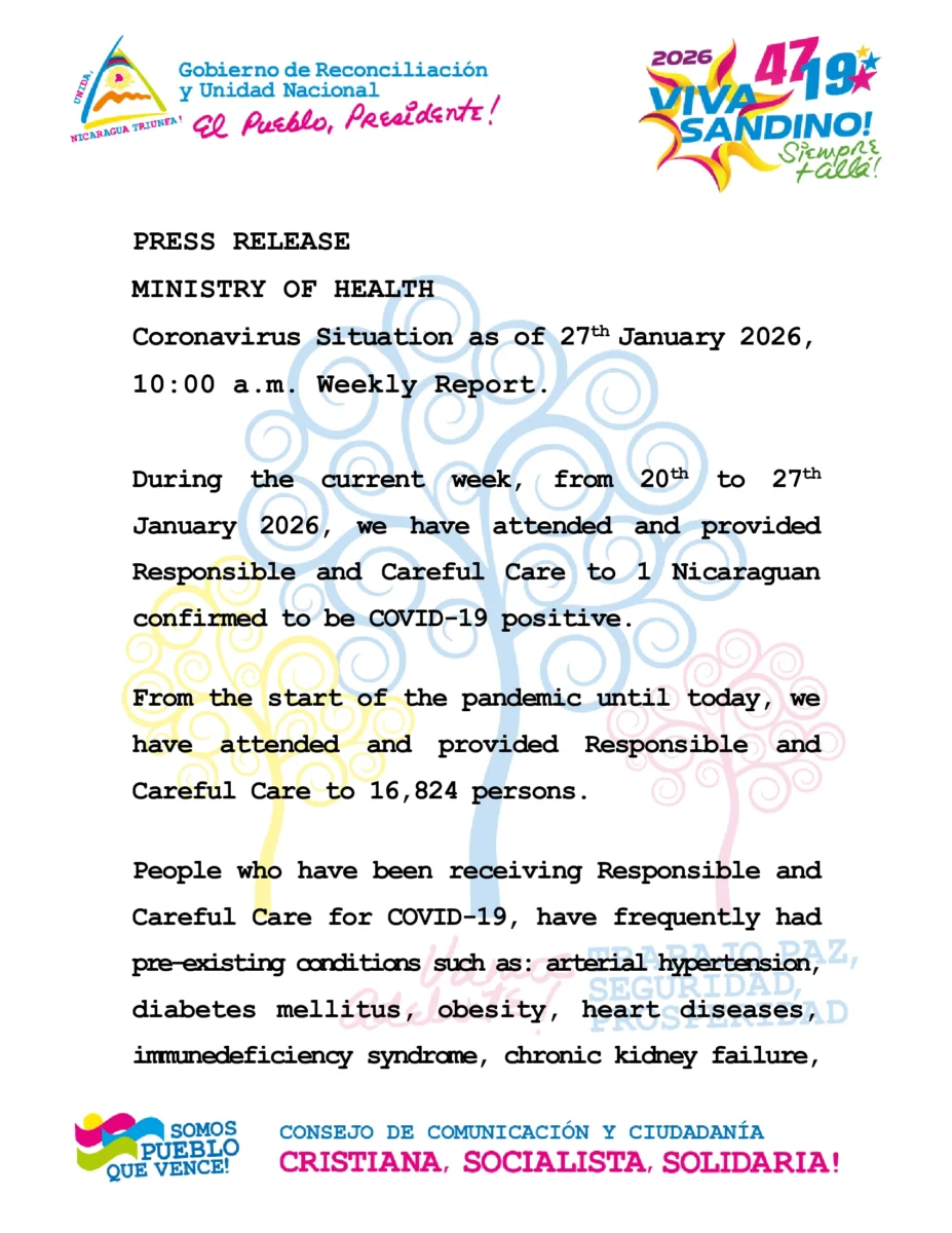 During the current week, from 20th to 27th January 2026, we have attended and provided Responsible and Careful Care to 1 Nicaraguan confirmed to be COVID-19 positive.