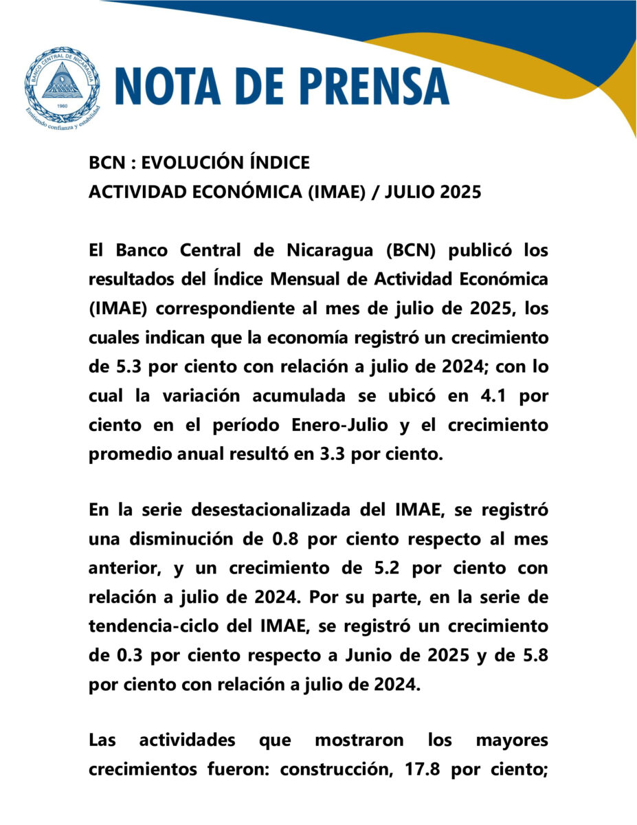 El Banco Central de Nicaragua (BCN) publicó los resultados del Índice Mensual de Actividad Económica (IMAE) correspondiente al mes de julio de 2025, los cuales indican que la economía registró un crecimiento de 5.3 por ciento con relación a julio de 2024; con lo cual la variación acumulada se ubicó en 4.1 por ciento en el período Enero-Julio y el crecimiento promedio anual resultó en 3.3 por ciento.