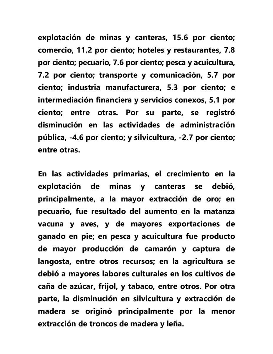 En las actividades primarias, el crecimiento en la explotación de minas y canteras se debió, principalmente, a la mayor extracción de oro; en pecuario, fue resultado del aumento en la matanza vacuna y aves, y de mayores exportaciones de ganado en pie; en pesca y acuicultura fue producto de mayor producción de camarón y captura de langosta, entre otros recursos; en la agricultura se debió a mayores labores culturales en los cultivos de caña de azúcar, frijol, y tabaco, entre otros. Por otra parte, la disminución en silvicultura y extracción de madera se originó principalmente por la menor extracción de troncos de madera y leña.