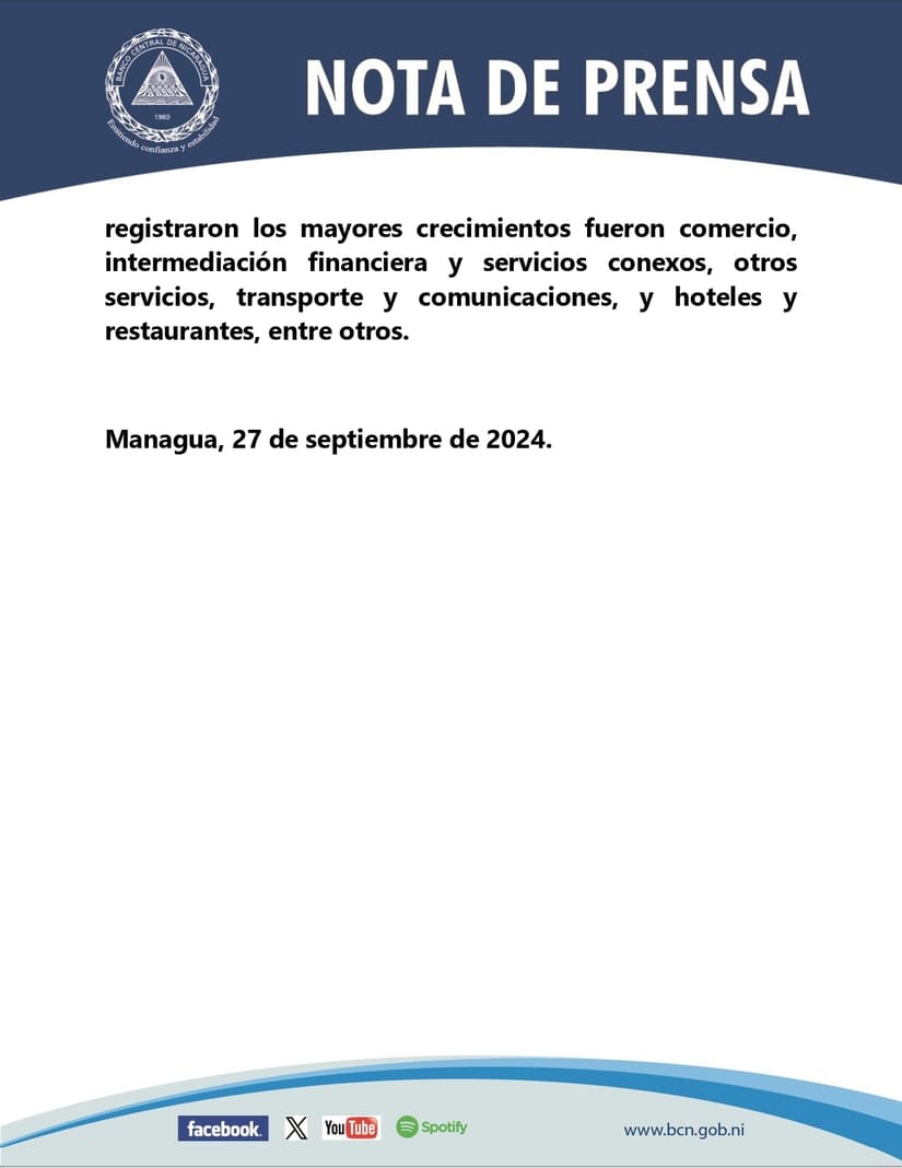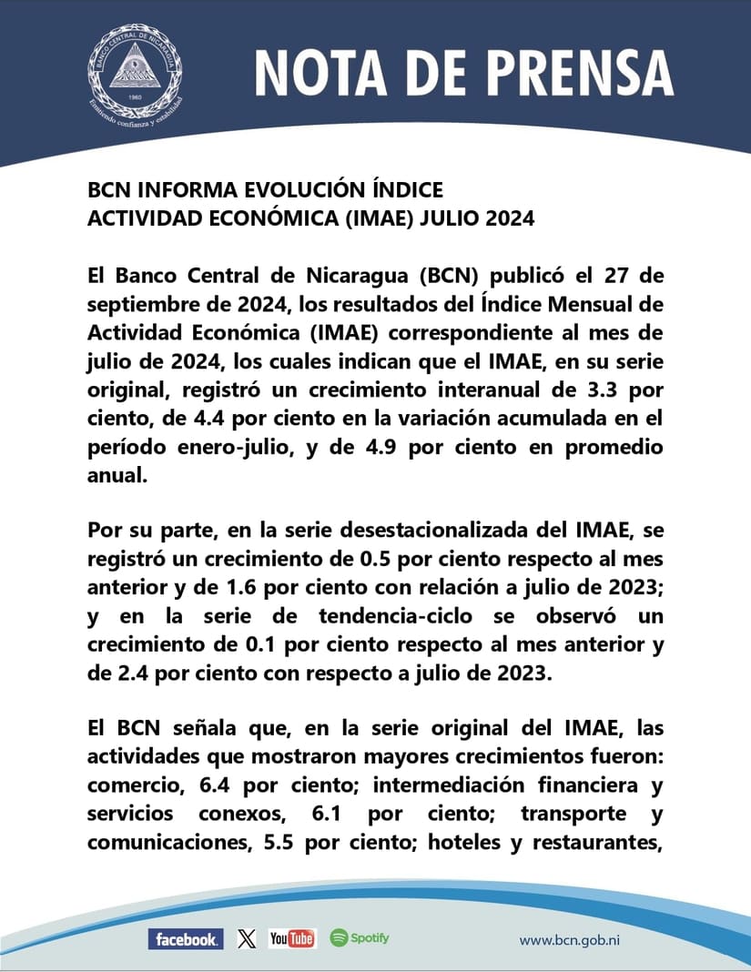 El Banco Central de Nicaragua (BCN) publicó el 27 de septiembre de 2024, los resultados del Índice Mensual de Actividad Económica (IMAE) correspondiente al mes de julio de 2024, los cuales indican que el IMAE, en su serie original, registró un crecimiento interanual de 3.3 por ciento, de 4.4 por ciento en la variación acumulada en el período enero-julio, y de 4.9 por ciento en promedio anual.