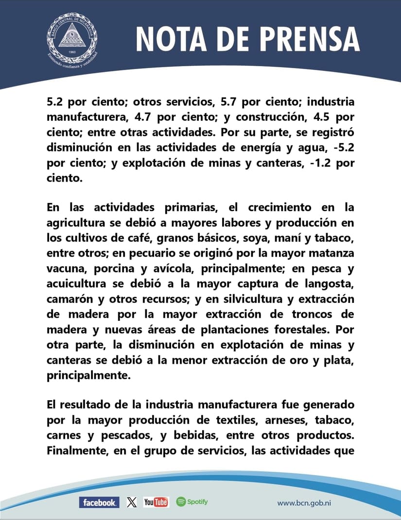 En las actividades primarias, el crecimiento en la agricultura se debió a mayores labores y producción en los cultivos de café, granos básicos, soya, maní y tabaco, entre otros; en pecuario se originó por la mayor matanza vacuna, porcina y avícola, principalmente; en pesca y acuicultura se debió a la mayor captura de langosta, camarón y otros recursos; y en silvicultura y extracción de madera por la mayor extracción de troncos de madera y nuevas áreas de plantaciones forestales. Por otra parte, la disminución en explotación de minas y canteras se debió a la menor extracción de oro y plata, principalmente.