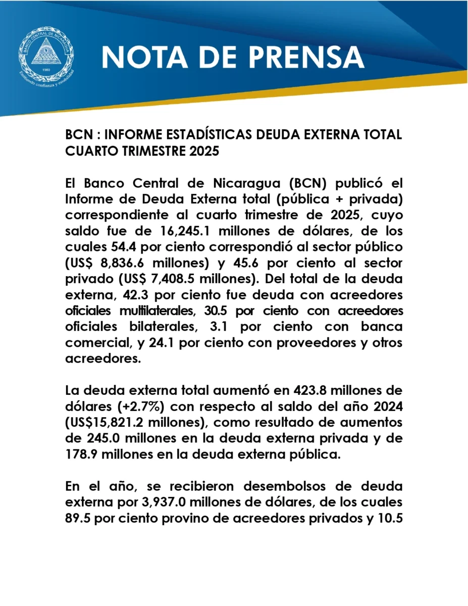 El Banco Central de Nicaragua (BCN) publicó el Informe de Deuda Externa total (pública + privada) correspondiente al cuarto trimestre de 2025, cuyo saldo fue de 16,245.1 millones de dólares, de los cuales 54.4 por ciento correspondió al sector público (US$ 8,836.6 millones) y 45.6 por ciento al sector privado (US$ 7,408.5 millones). Del total de la deuda externa, 42.3 por ciento fue deuda con acreedores oficiales multilaterales, 30.5 por ciento con acreedores oficiales bilaterales, 3.1 por ciento con banca comercial, y 24.1 por ciento con proveedores y otros acreedores.