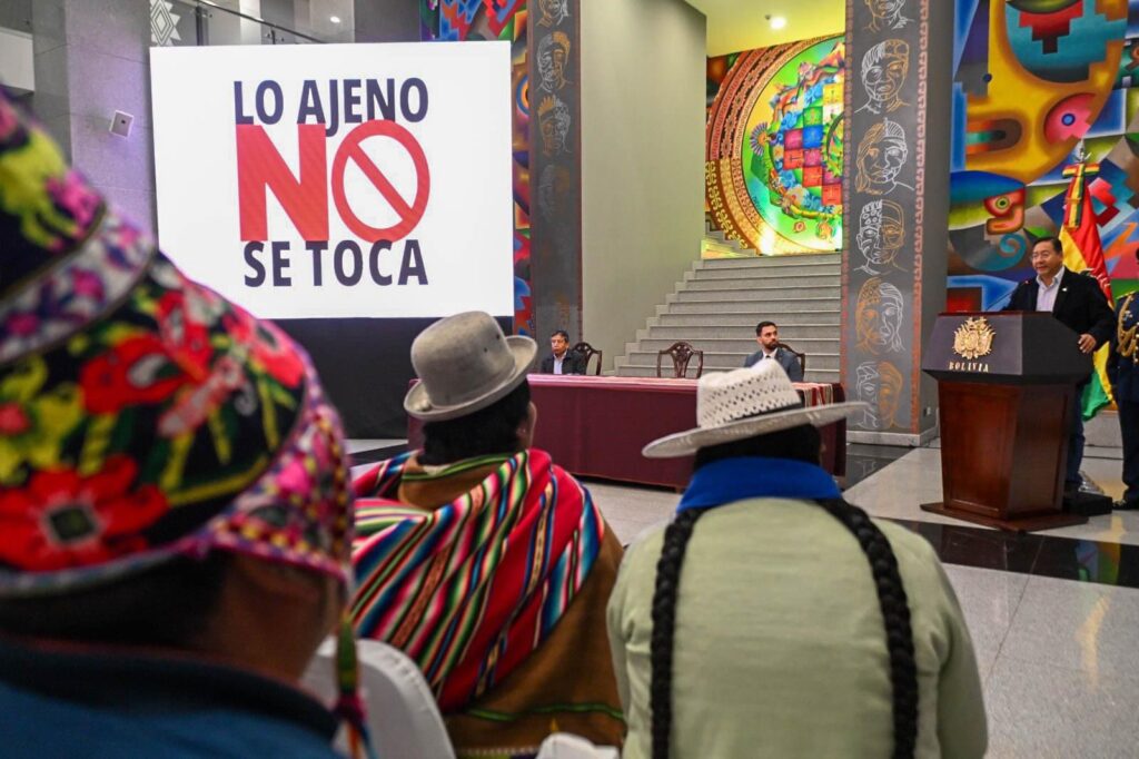 Desde la casa de Gobierno en La Paz, el ministro de Gobierno, Eduardo del Castillo, presentó el proyecto de ley “Lo ajeno no se toca“, al que asistieron el presidente del país, Luis Arce, así como autoridades nacionales, jefes policiales, funcionarios y sindicalistas cercanos al Ejecutivo.