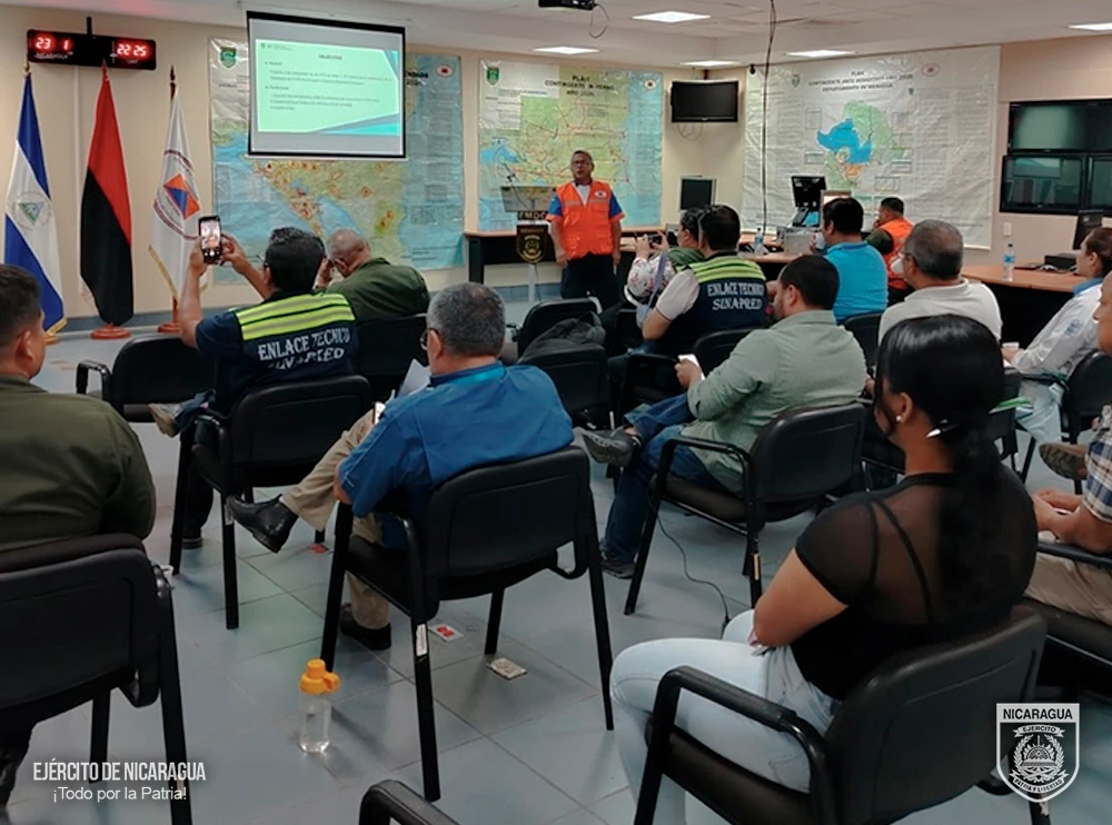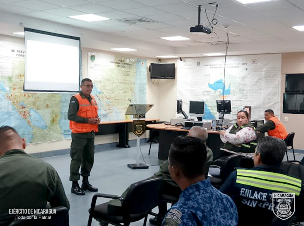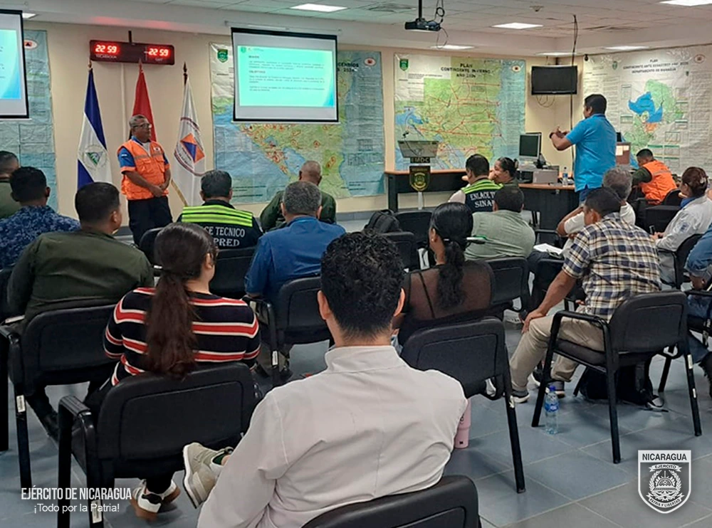 El Ejército de Nicaragua consecuente con el lema de que “Somos el Pueblo mismo uniformado trabajando en su propio beneficio”, el 27 de febrero de 2026, a través del Estado Mayor de la Defensa Civil, en coordinación con la Codirección del Sistema Nacional de Prevención, Mitigación y Atención de Desastres (SINAPRED), realizó capacitación sobre el “Funcionamiento de las Comisiones de Trabajo Sectoriales en el Centro de Operaciones de Desastres”, con la participación de los enlaces técnicos institucionales de las comisiones de trabajo sectorial de Operaciones Especiales, Salud, Seguridad, Transporte e Infraestructura y Grupos Vulnerables y oficiales enlace de la Dirección de Operaciones y Planes, Fuerza Naval, Fuerza Aérea y Defensa Antiaérea, Cuerpo Médico Militar y la Unidad Humanitaria y de Rescate “Comandante William Ramírez Solórzano”.