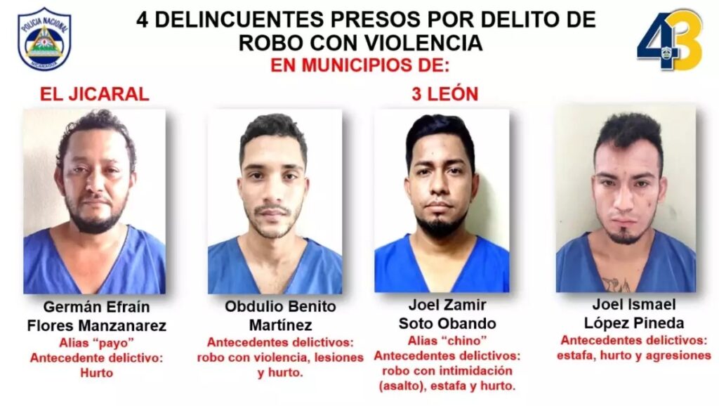 El Jefe de la Policía en León, Comisionado Mayor Fidel Domínguez, dio a conocer que entre los detenidos se encuentra: Jonathan López Martínez y Danny Francisco Munguía Pérez por cometer robo con fuerza en los municipios de León y Nagarote.