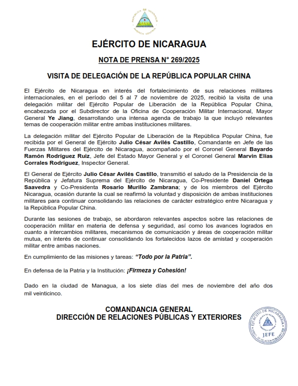 El Ejército de Nicaragua en interés del fortalecimiento de sus relaciones militares internacionales, en el período del 5 al 7 de noviembre de 2025, recibió la visita de una delegación militar del Ejército Popular de Liberación de la República Popular China, encabezada por el Subdirector de la Oficina de Cooperación Militar Internacional, Mayor General Ye Jiang, desarrollando una intensa agenda de trabajo la que incluyó relevantes temas de cooperación militar entre ambas instituciones militares.