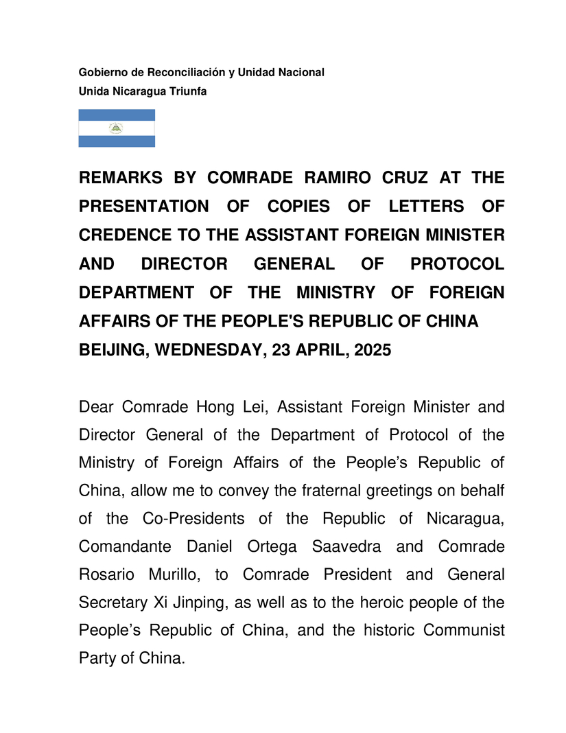 La tarde de este Jueves 23 de Abril del 2025, el Compañero Ramiro Cruz presentó Copias de Estilo ante el Ministerio de Relaciones Exteriores de la República Popular China, acreditándose formalmente como Embajador de la República de Nicaragua ante el Pueblo y Gobierno Chino.
