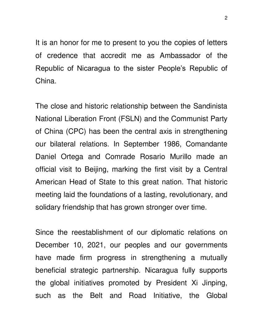 Las Copias de Estilo fueron recibidas por el Compañero Hong Lei, Ministro Asistente y Director General del Departamento de Protocolo de la Cancillería China, quien envió saludos al Pueblo y Gobierno de Nicaragua; y destacó los históricos Lazos de Amistad y Cooperación que unen a China y Nicaragua; y al Frente Sandinista de Liberación Nacional (FSLN) con el Partido Comunista de China (PCCh).