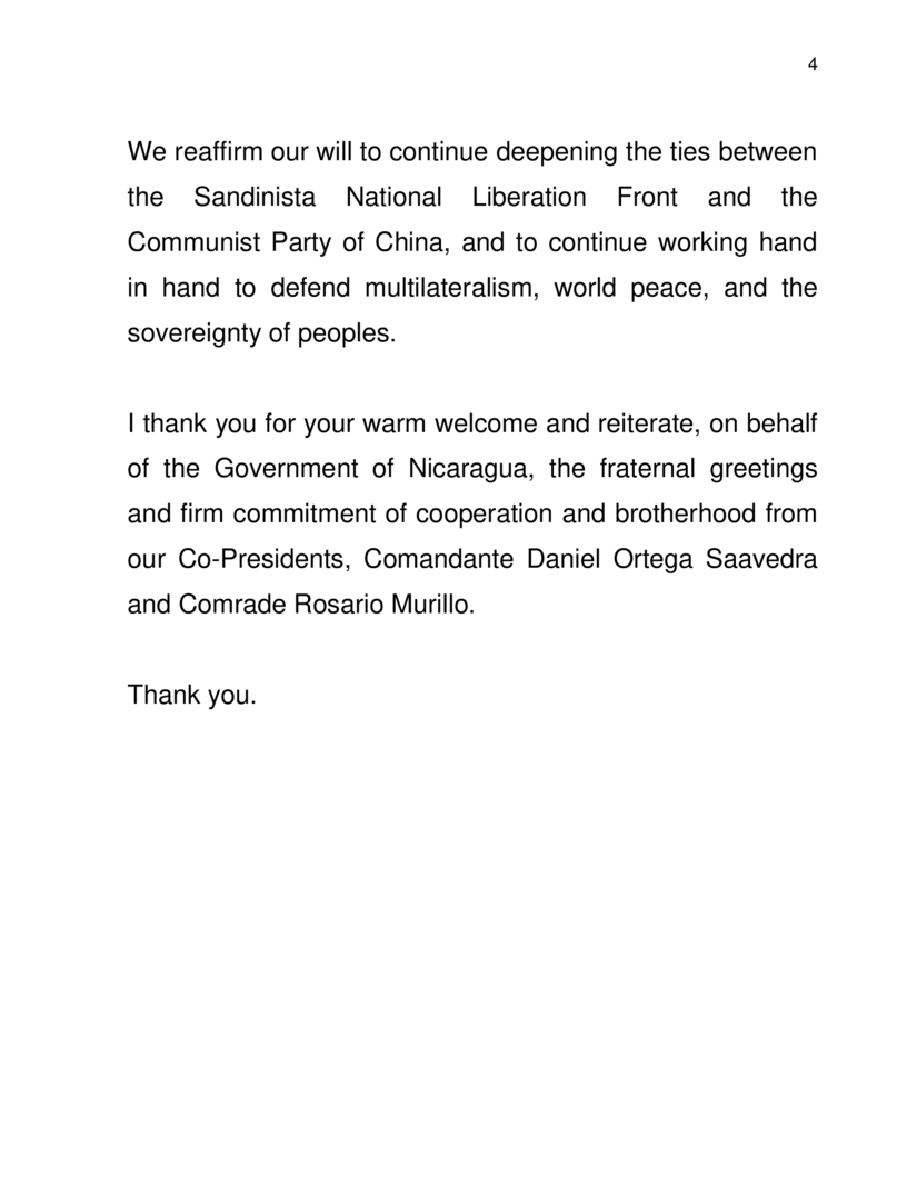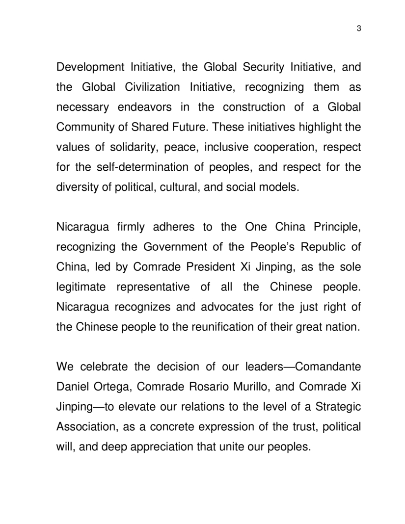 Reiteró que Nicaragua se adhiere firmemente al Principio de Una Sola China, reconociendo al Gobierno de la República Popular China, presidido por el Compañero Presidente Xi Jinping, como el único Representante legítimo de todo el Pueblo chino.