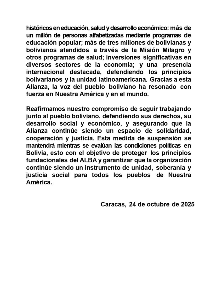 We reaffirm our commitment to continue working alongside the Bolivian people, defending their rights, their social and economic development, and ensuring that the Alliance remains a space for solidarity, cooperation, and justice. This suspension will remain in place while the political conditions in Bolivia are assessed. This is intended to protect ALBA’s founding principles and ensure that the organization continues to be an instrument of unity, sovereignty, and social justice for all the peoples of Our America.
