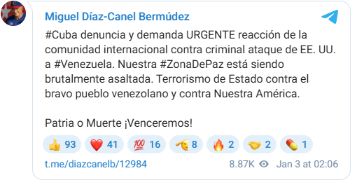 El Presidente de la República de Cuba denunció, a través de su cuenta oficial en Telegram, el ataque criminal perpetrado por Estados Unidos contra la República Bolivariana de Venezuela, expresando su firme rechazo a toda acción que atente contra la soberanía, la paz y la estabilidad de los pueblos de la región.