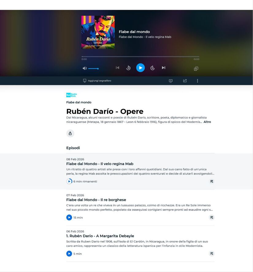 Nuestra Embajada en Italia en colaboración con el programa infantil “Cuentos del Mundo”, de Radio Rai Kids, han puesto en onda cuentos y poemas de Rubén Darío, contenidos en el libro Azul.