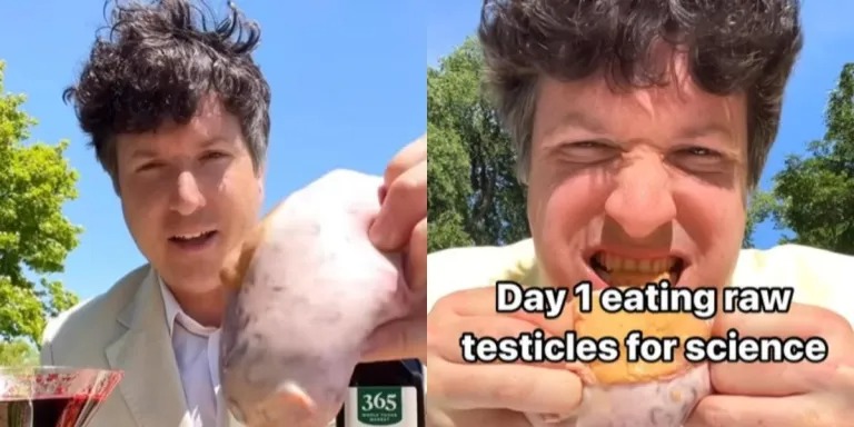 En su perfil, se le observa comiendo de distintas maneras los testículos crudos. En uno de ellos, simplemente se ve como toma un cuchillo para abrir y comer el interior solo usando sus manos.