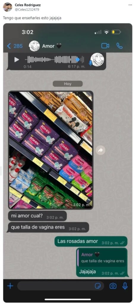 La imagen exhibía una docena de paquetes de toallitas, sin embargo, lo extraordinario vino después. “Mi amor, ¿cuál? ¿Qué talla de vagina eres?”, fue lo que preguntó el chico, y provocó la risa de su pareja. Este tuit generó rápidamente una gran repercusión en la plataforma X, donde los usuarios reaccionaron con graciosos comentarios.