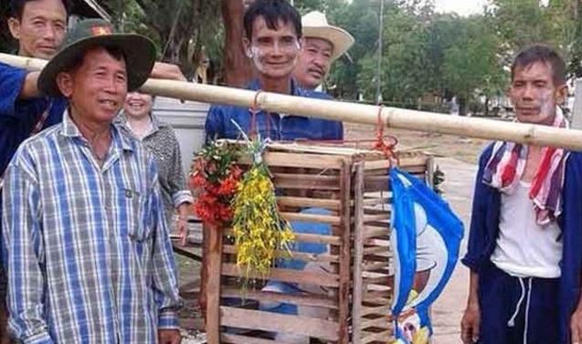 Vistiendo brillantes trajes, los participantes en la procesión pasearon una jaula decorada con guirnaldas amarillas y el peluche de Doraemon en su interior, que algunos transeúntes rociaban con agua.