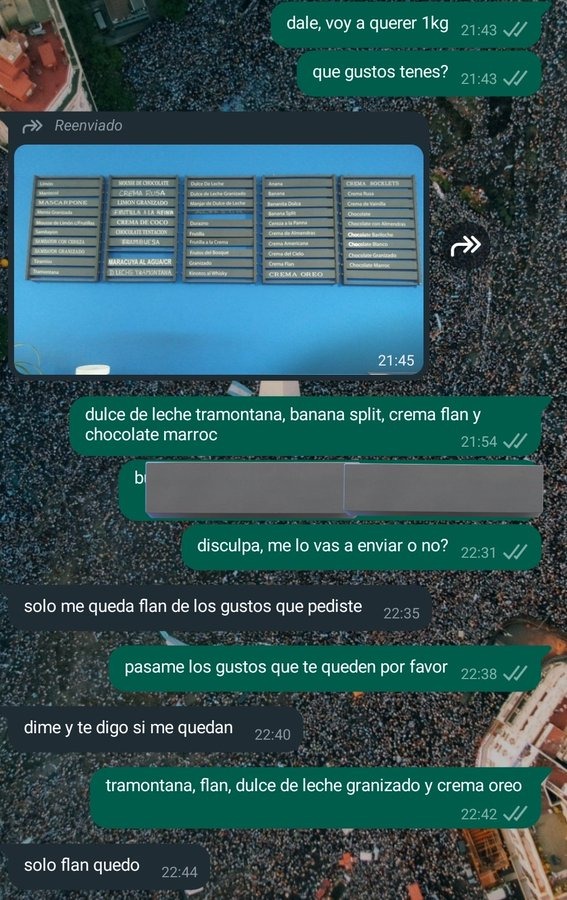 En las capturas de pantalla de la conversación de WhatsApp, se aprecia la poca voluntad del empleado y lo complicado que resultó el simple hecho de pedir helado. Franco insistía para que le informaran cuáles eran los sabores disponibles, porque la mayoría de los que escogía no había, básicamente el problema era que el único sabor que tenían, al parecer, era crema flan. Pero el de la heladería le mostraba otros, para luego decirle que no. Lo cual irritó al muchacho que criticó al local en su posteo.