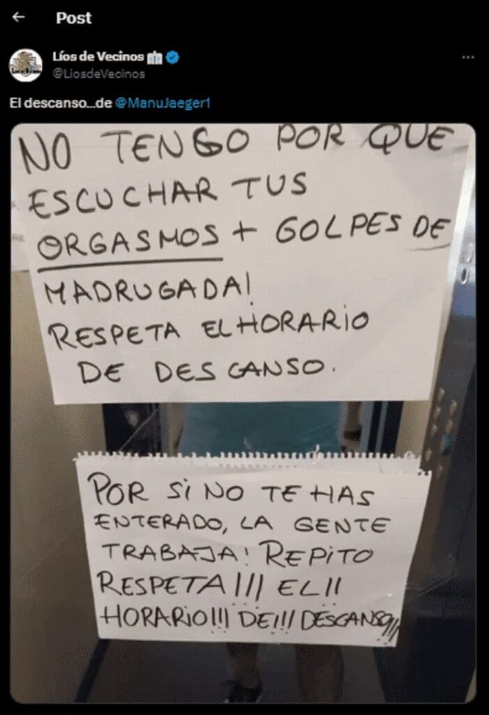 El vecino cansado de seguir en lo mismo puso un contundente cartel, para los otros inquilinos de al lado, en el ascensor del edificio en el que ambos habitan. “No tengo por qué escuchar tus orgasmos y golpes de madrugada”, comenzaba diciendo el cartel, en la misma línea, escribió que respetaran el horario de descanso. En otra hoja puso “Por si no te has enterado, la gente trabaja. Repito: ¡Respeta el horario de descanso!”, resaltando su enojo.