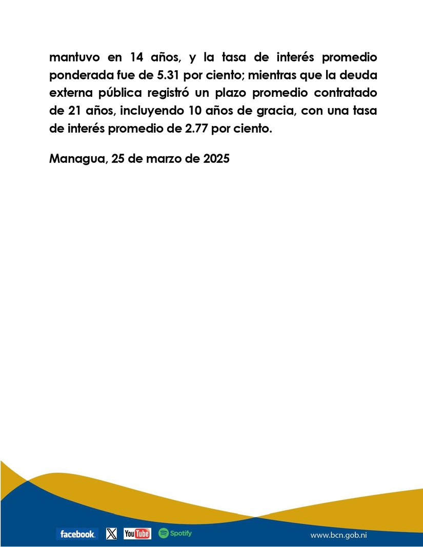 El Banco Central de Nicaragua (BCN) informó el 25 de marzo de 2025, los resultados de la Deuda Externa total (pública + privada) correspondiente al cuarto trimestre de 2024, cuyo saldo fue de 15,556.2 millones de dólares, de los cuales 55.7 por ciento (US$8,657.7 millones) correspondió al sector público y 44.3 por ciento (US$6,898.5 millones) al sector privado. Por su parte, el 44.4 por ciento de la deuda externa total fue con acreedores oficiales multilaterales, 31.8 por ciento con acreedores oficiales bilaterales, 21.5 por ciento con proveedores y otros (incluye créditos comerciales con empresas relacionadas) y 2.3 por ciento con banca comercial.