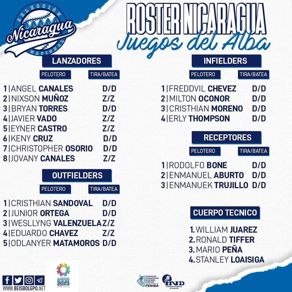 La Federación Nicaragüense de Béisbol Asociada (Feniba), anunció el roster oficial de 20 peloteros para los Juegos del ALBA, que se van a celebrar en Venezuela a partir del 21 de abril.