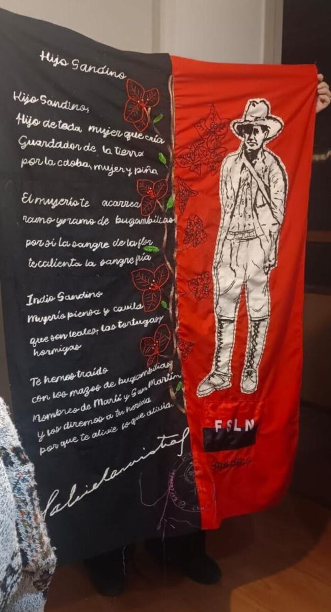 Las Compañeras Sandra Cornejo (Paloma Rodríguez), también Cantautora, Inés Pérez y Nora Soto, quienes viajarán desde Chile a nuestro 46/19, bordaron Telón-Lienzo que lleva por nombre “Hijo Sandino”, Poema de Gabriela Mistral, y, la imagen de nuestro General, unidos por Buganvillas.