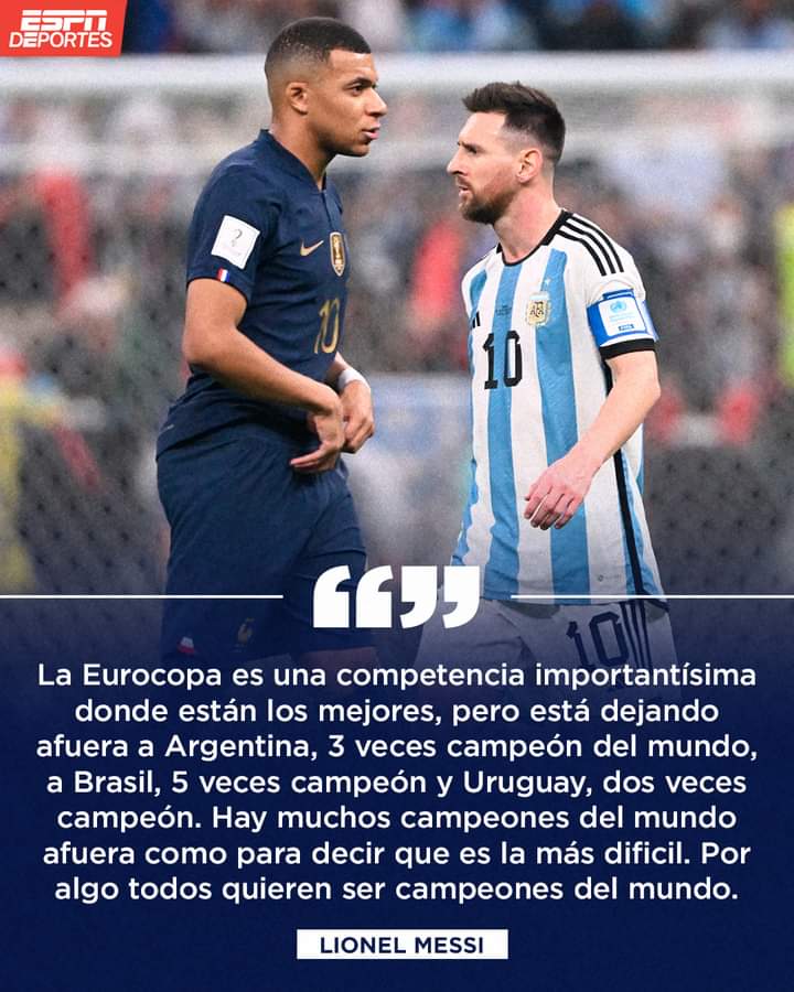 El campeón del mundo con Argentina, Leo Messi , respondió a las declaraciones de Kylian Mbappé, quien hace unos días manifestó que ganar la Eurocopa es más difícil que conquistar la Copa Mundial.