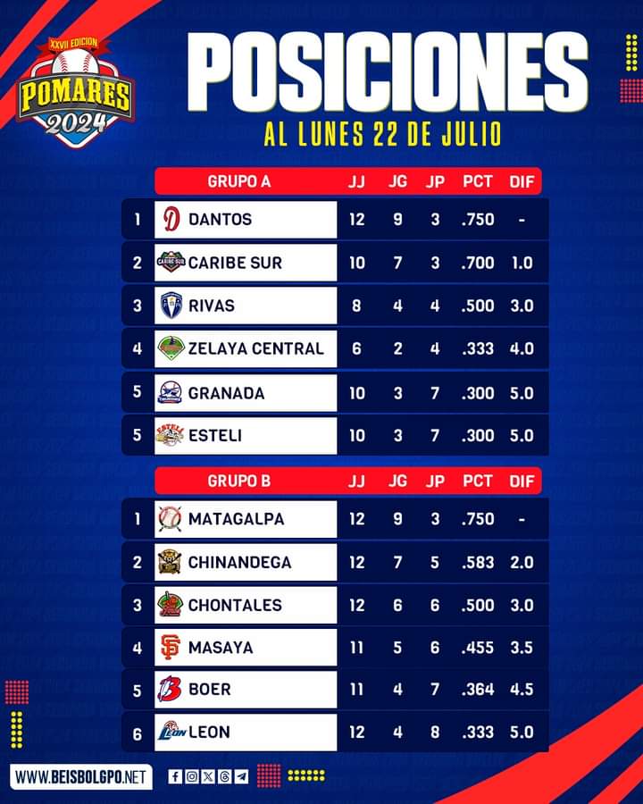 Los Indígenas de Matagalpa siguen líderes del Grupo ‘B’ del Campeonato Germán Pomares Ordóñez con registro de nueve victorias y tres descalabros. Después vienen los Tigres de Chinandega ubicados a dos juegos (7-5) de distancia.