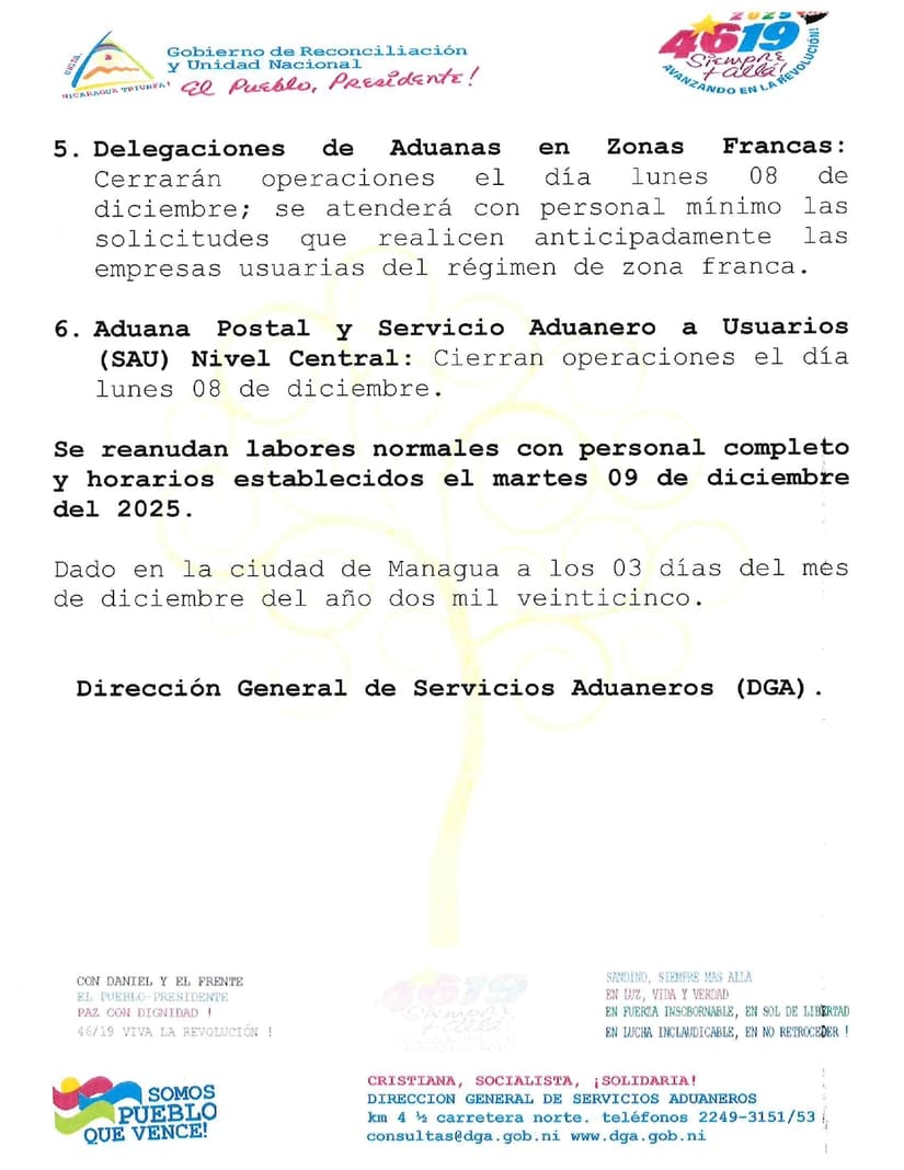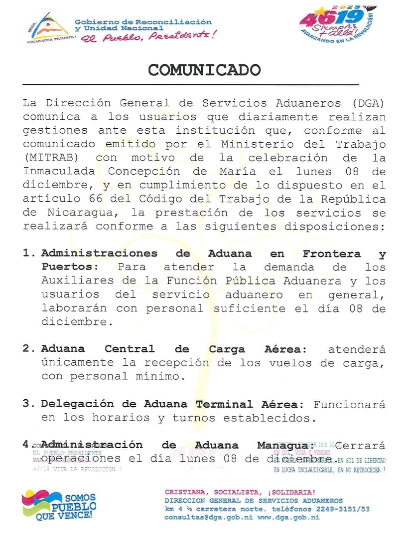 Por motivo de la celebración a la Inmaculada Concepción de María, el próximo ocho de diciembre, la Dirección General de Servicios Aduaneros (DGA) emitió un comunicado sobre la prestación de servicios ese día.