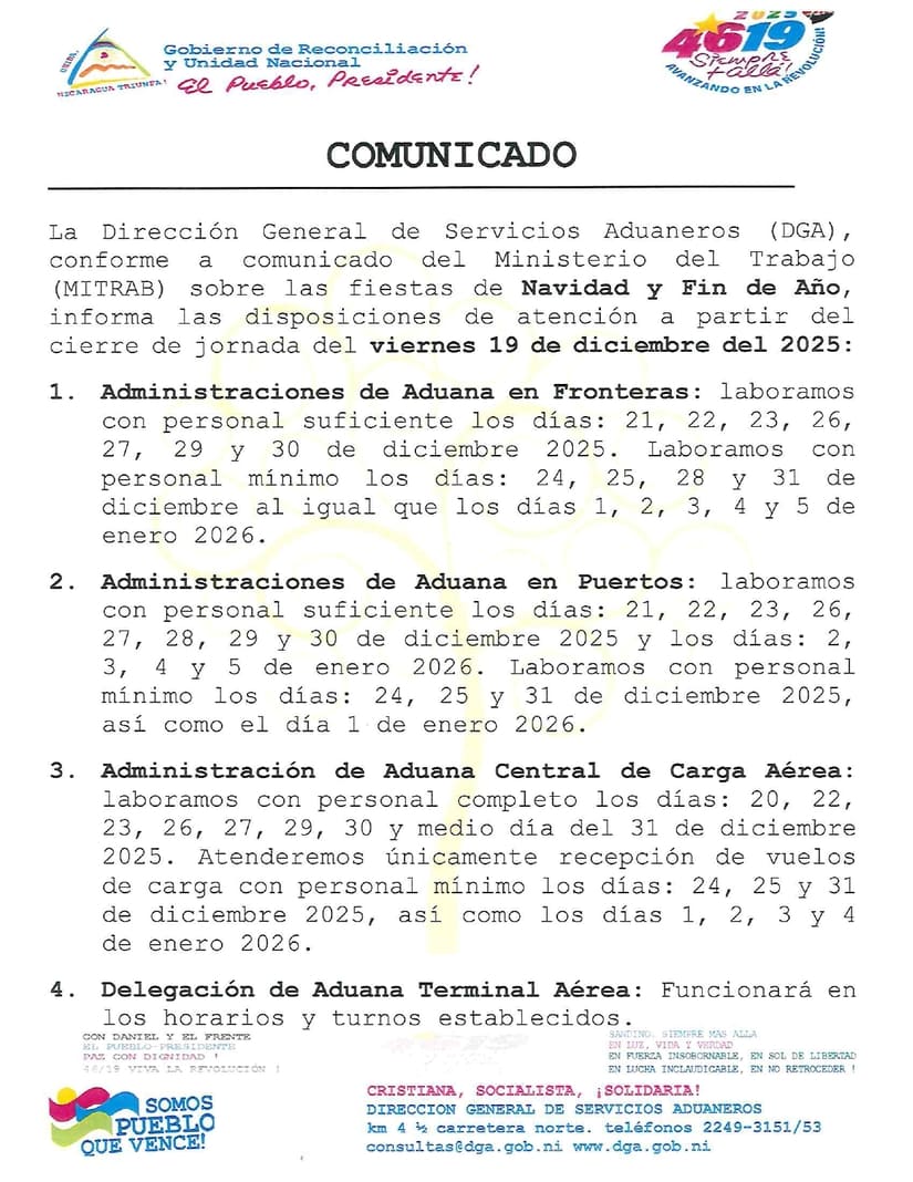 La Dirección General de Servicios Aduaneros (DGA), conforme a comunicado del Ministerio del Trabajo (MITRAB) sobre las fiestas de Navidad y Fin de Año, informa las disposiciones de atención a partir del cierre de jornada del viernes 19 de diciembre del 2025: