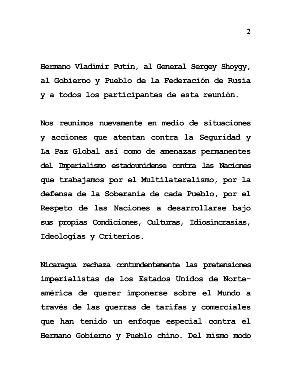 Nicaragua rechaza contundentemente las pretensiones imperialistas de los Estados Unidos de Norte-américa de querer imponerse sobre el Mundo a través de las guerras de tarifas y comerciales que han tenido un enfoque especial contra el Hermano Gobierno y Pueblo chino. Del mismo modo rechazamos las medidas coercitivas unilaterales mal llamadas sanciones que Estados Unidos y Europa aplican contra los Países que no se someten a sus mandatos y dominación, Países Hermanos como Rusia, China, Irán, Cuba, Venezuela y Nicaragua. Condenamos el genocidio sufrido por el Pueblo Hermano de Palestina a manos del Gobierno de Israel con el apoyo de los Estados Unidos y reiteramos nuestro apoyo firme al Derecho del Estado Palestino de existir y vivir en paz. Reiteramos también nuestra defensa firme al Principio de Una Sola China y rechazamos todas la acciones que sabemos se originan desde los Estados Unidos que atentan contra la Estabilidad, la Paz y la Tranquilidad del Hermano Pueblo chino. Reiteramos nuestro firme Acompañamiento y Solidaridad con la Federación de Rusia en la lucha que libran contra el Nazismo ucraniano apoyado por la OTAN, a 80 años de la Victoria sobre el Fascismo en la Gran Guerra Patria la lucha continúa, el enemigo es el mismo, como dijo el Canciller Lavrov se trata de la lucha entre el Bien y al Mal, y Nicaragua está con Rusia por el Bien de la Humanidad. También queremos reiterar nuestro rechazo y condena al trato inhumano y cruel al cual están siendo sometidos los inmigrantes por el Gobierno estadounidense, especialmente a los Hermanos Latinoamericanos y Caribeños, demandamos el cese de esta práctica indigna, racista y fascista.