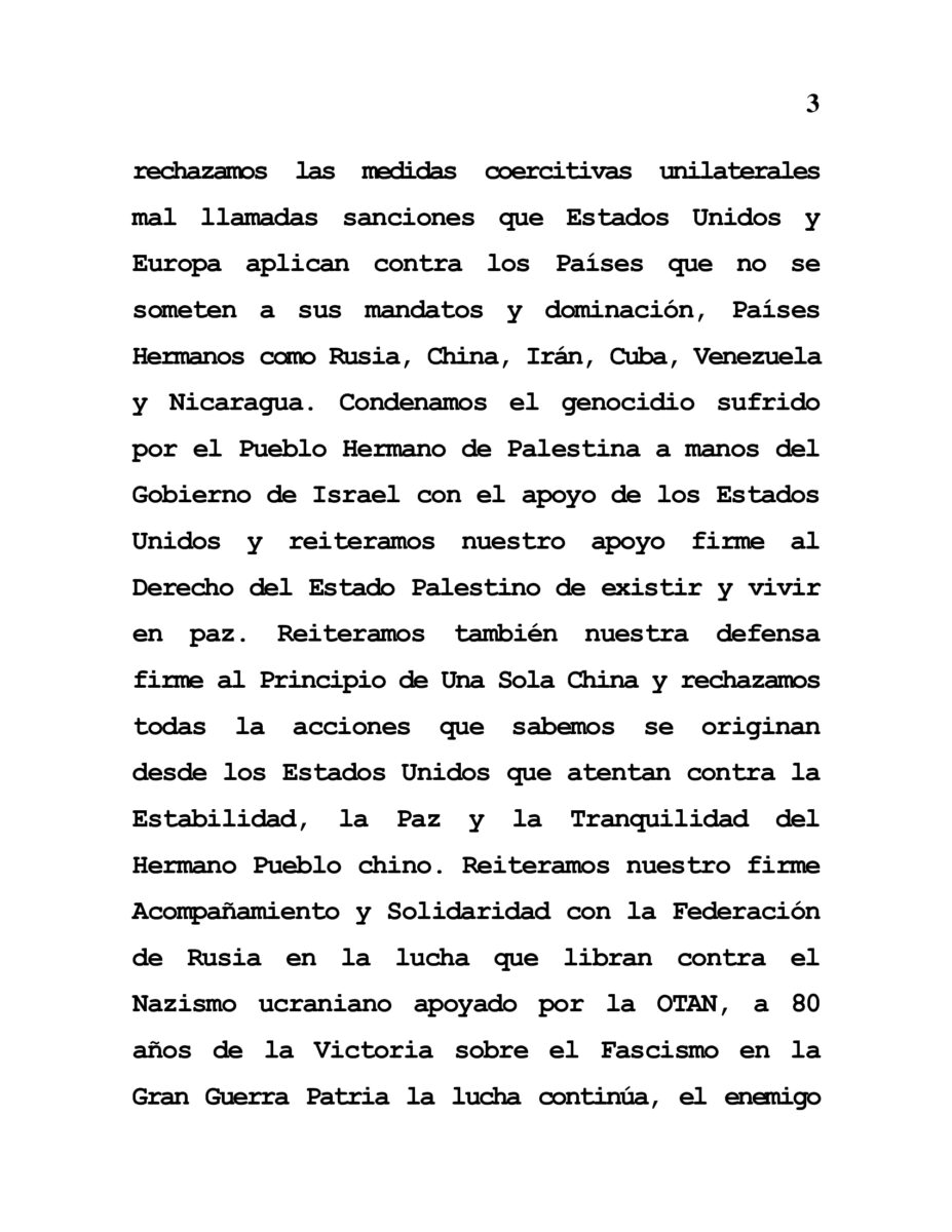 Nos reunimos nuevamente en medio de situaciones y acciones que atentan contra la Seguridad y La Paz Global así como de amenazas permanentes del Imperialismo estadounidense contra las Naciones que trabajamos por el Multilateralismo, por la defensa de la Soberanía de cada Pueblo, por el Respeto de las Naciones a desarrollarse bajo sus propias Condiciones, Culturas, Idiosincrasias, Ideologías y Criterios.