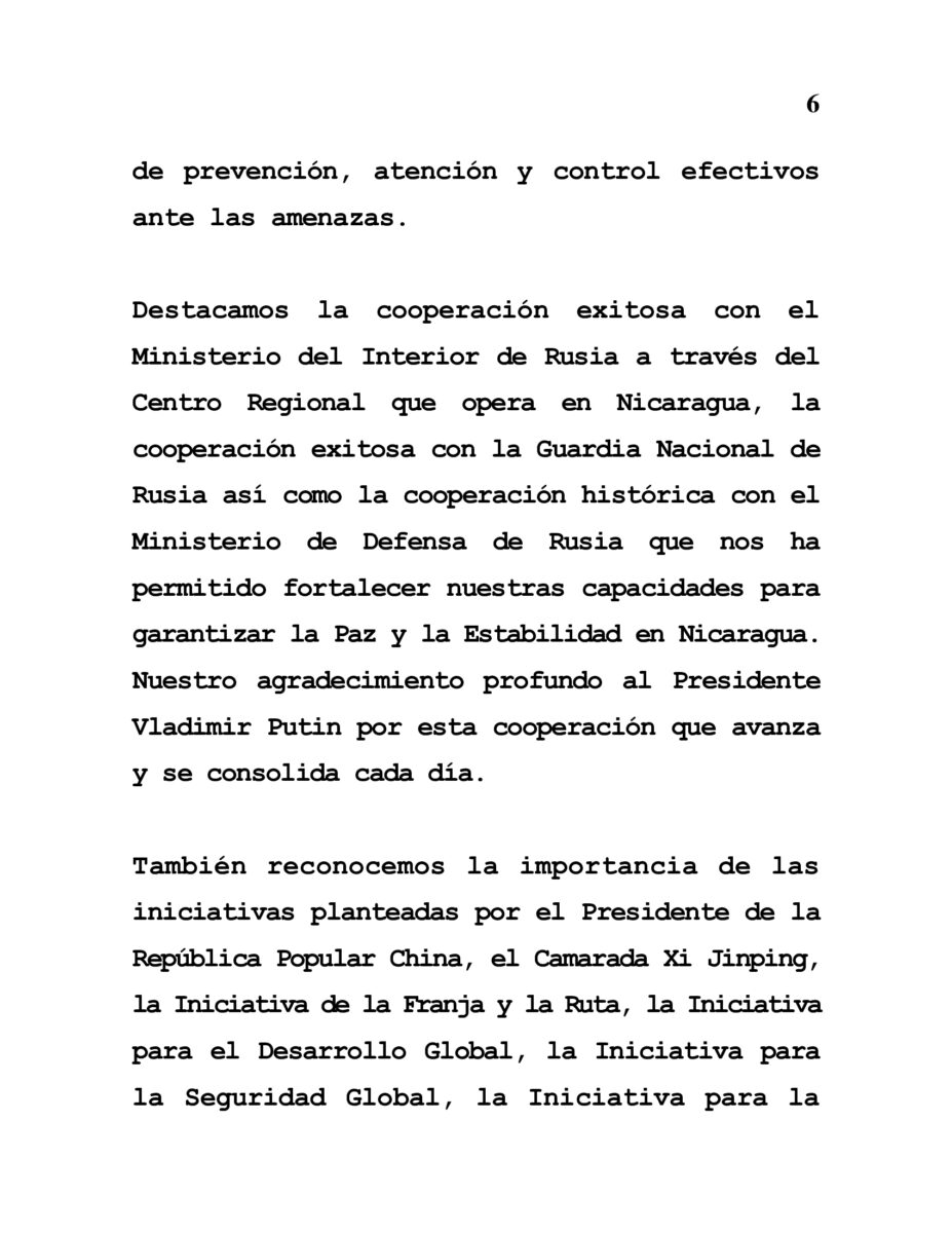 También reconocemos la importancia de las iniciativas planteadas por el Presidente de la República Popular China, el Camarada Xi Jinping, la Iniciativa de la Franja y la Ruta, la Iniciativa para el Desarrollo Global, la Iniciativa para la Seguridad Global, la Iniciativa para la Gobernanza de la Inteligencia Artificial y la Iniciativa para el intercambio entre Civilizaciones Globales. En el marco de estas Iniciativas Nicaragua está cooperando con China en todos los campos incluyendo la Seguridad y la Defensa.