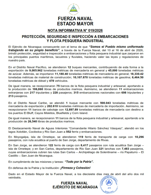 El Ejército de Nicaragua consecuente con el lema de que “Somos el Pueblo mismo uniformado trabajando en su propio beneficio”, a través de la Fuerza Naval, del 10 al 16 de abril de 2026, brindó protección, seguridad e inspección a embarcaciones y flota pesquera industrial que zarparon en los principales puertos marítimos, lacustres y fluviales, haciendo valer las leyes y regulaciones de nuestro país.