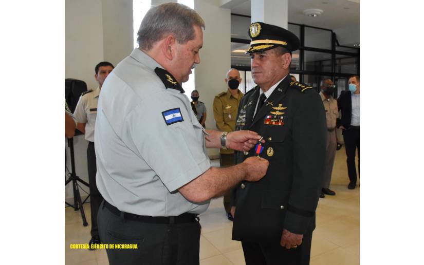 El Ejército de Nicaragua consecuente con el lema de que “Somos el Pueblo mismo uniformado trabajando en su propio beneficio”, el 28 de octubre de 2022, en las instalaciones del Casino Militar “Simón Bolívar”, por órdenes N.º 097 y 098/2022 del Comandante en Jefe del Ejército de Nicaragua, General de Ejército Julio César Avilés Castillo, se otorgó la condecoración “Medalla Honor al Mérito Amistad y Cooperación”, al Agregado de Defensa a la Embajada de la República de Honduras en la República de Nicaragua, Coronel de Inf. DEM Román Gómez Reyes, asimismo, al Agregado de Defensa a la Embajada de la República de El Salvador en la República de Nicaragua, Coronel de Transmisiones DEM Jorge Alberto Menjívar Martínez, en reconocimiento a los lazos de amistad y cooperación con el Ejército de Nicaragua.