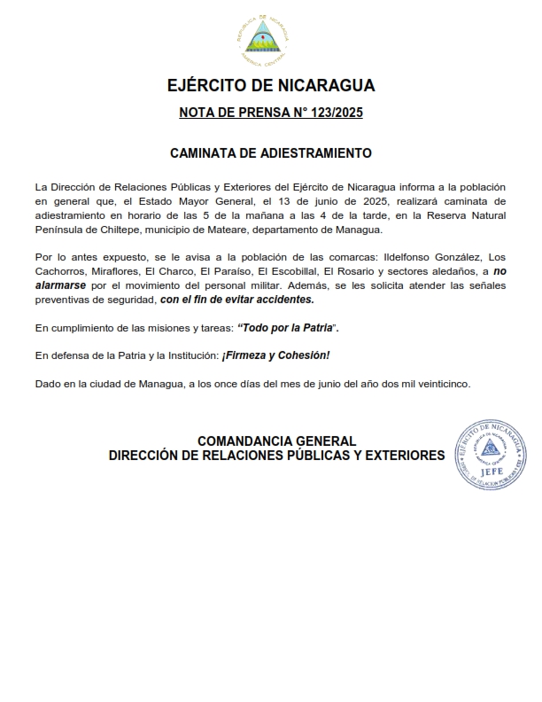 La Dirección de Relaciones Públicas y Exteriores del Ejército de Nicaragua informa a la población en general que, el Estado Mayor General, el 13 de junio de 2025, realizará caminata de adiestramiento en horario de las 5 de la mañana a las 4 de la tarde, en la Reserva Natural Península de Chiltepe, municipio de Mateare, departamento de Managua.