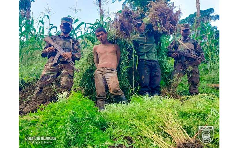 El Ejército de Nicaragua consecuente con el lema de que “Somos el Pueblo mismo uniformado trabajando en su propio beneficio”, en cumplimiento a la Estrategia de Estado “Muro de Contención”, el 6 de septiembre de 2023, a través de servicio operativo del 6 Comando Militar Regional, en la comunidad Pauniwás, municipio de Wiwilí, departamento de Jinotega, realizó la incautación e incineración de 8,000 plantas de marihuana de 2 metros de altura cada una, las que estaban sembradas entre un cultivo de maíz.