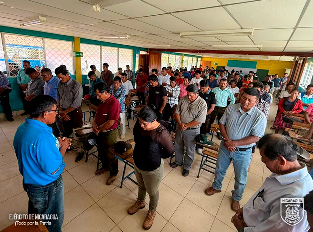 El Ejército de Nicaragua consecuente con el lema de que “Somos el Pueblo mismo uniformado trabajando en su propio beneficio”, el 27 de febrero de 2026, a través del jefe del Batallón Ecológico “BOSAWAS”, Coronel Inf. DEM David Cornelio Cedeño Hernández, participó en reunión con el Presidente de la Nación Mayangna y el Gobierno Territorial Indígena Mayangna Sauni As y 850 comunitarios indígenas, realizada en la comunidad Musawas, municipio de Bonanza, Región Autónoma de la Costa Caribe Norte, con el objetivo de escuchar sus planteamientos relacionados al Plan de Protección al Medioambiente y los Recursos Naturales.