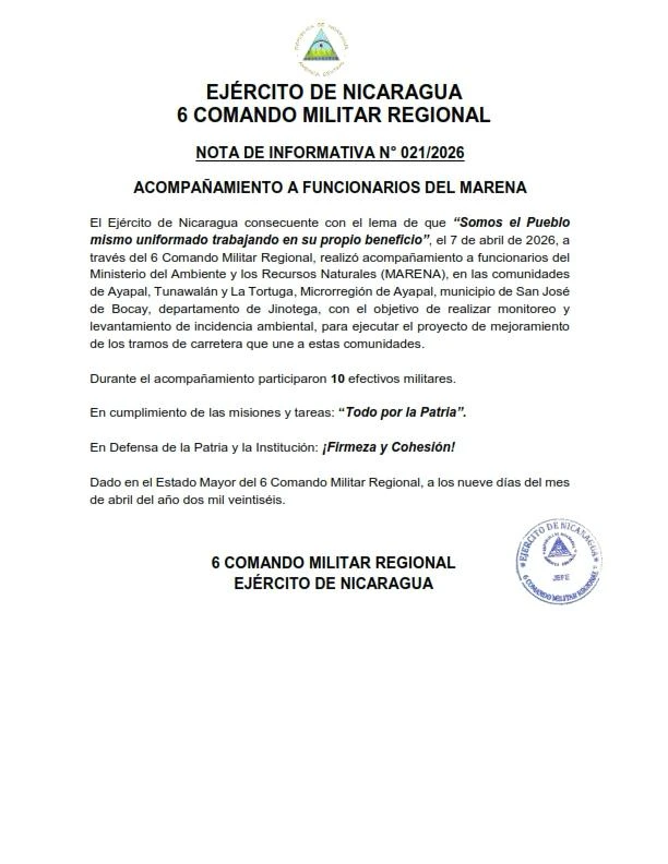 El Ejército de Nicaragua consecuente con el lema de que “Somos el Pueblo mismo uniformado trabajando en su propio beneficio”, el 7 de abril de 2026, a través del 6 Comando Militar Regional, realizó acompañamiento a funcionarios del Ministerio del Ambiente y los Recursos Naturales (MARENA), en las comunidades de Ayapal, Tunawalán y La Tortuga, Microrregión de Ayapal, municipio de San José de Bocay, departamento de Jinotega, con el objetivo de realizar monitoreo y levantamiento de incidencia ambiental, para ejecutar el proyecto de mejoramiento de los tramos de carretera que une a estas comunidades.