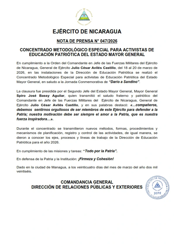 En cumplimiento a la Orden del Comandante en Jefe de las Fuerzas Militares del Ejército de Nicaragua, General de Ejército Julio César Avilés Castillo, del 18 al 20 de marzo de 2026, en las instalaciones de la Dirección de Educación Patriótica se realizó el Concentrado Metodológico Especial para activistas de Educación Patriótica del Estado Mayor General, en saludo a la Jornada Conmemorativa de “Darío a Sandino”.