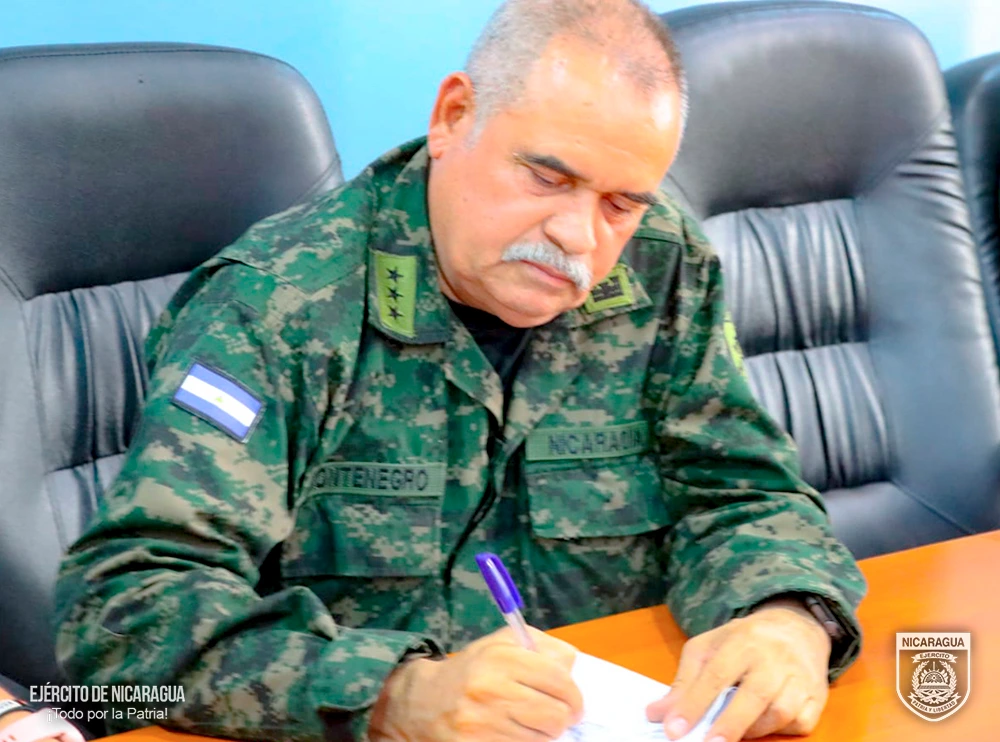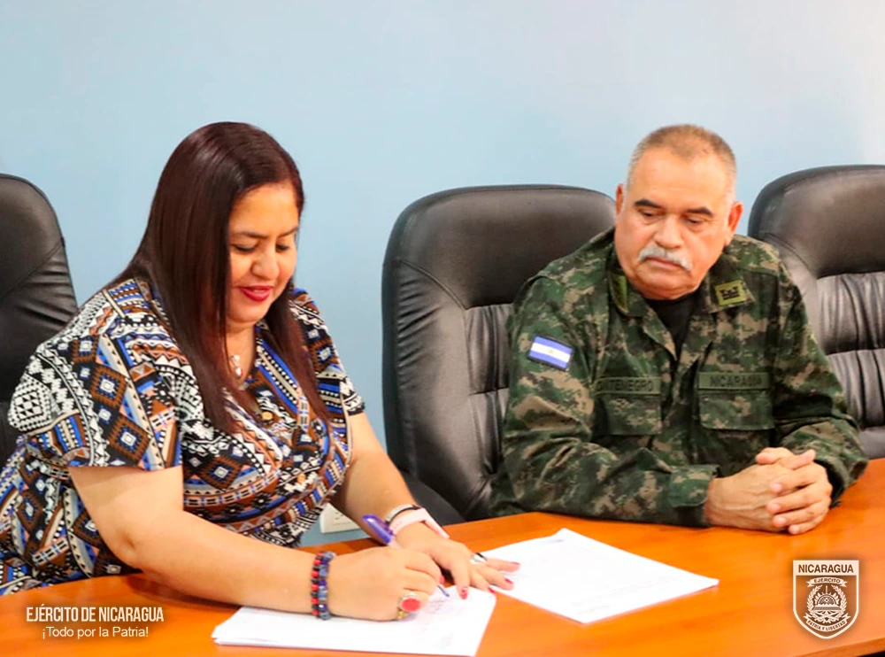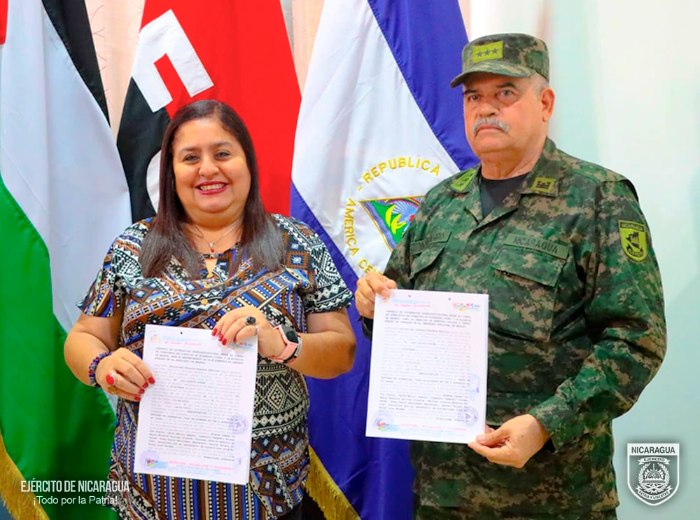 El Ejército de Nicaragua consecuente con el lema de que “Somos el Pueblo mismo uniformado trabajando en su propio beneficio”, el 15 de abril de 2026, a través del jefe del Cuerpo de Ingenieros “General de Brigada Miguel Ángel Ortez y Guillén”, Coronel Ing. DEM Omar Joaquín Montenegro Martínez, participó en firma de convenio con la alcaldesa del municipio de Masaya, departamento de Masaya, doctora Janina del Socorro Padilla Noguera, para el desarrollo de un proyecto de rehabilitación y mejoramiento de camino rural.