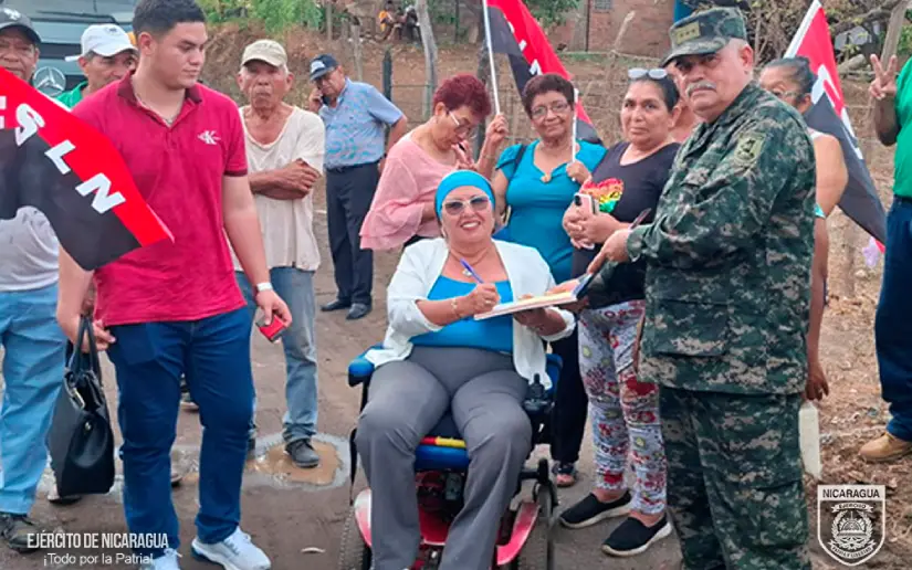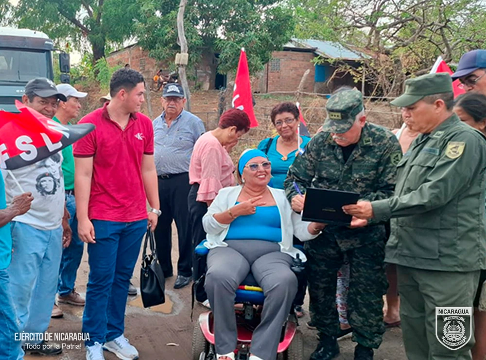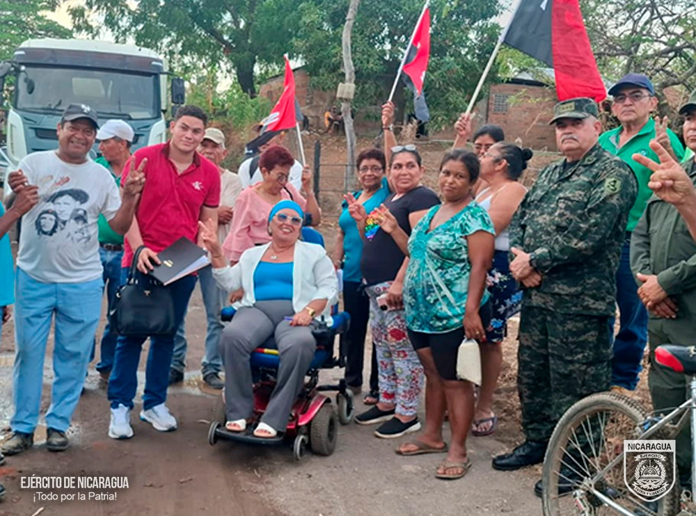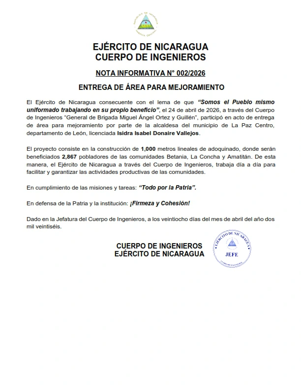 El Ejército de Nicaragua consecuente con el lema de que “Somos el Pueblo mismo uniformado trabajando en su propio beneficio”, el 24 de abril de 2026, a través del Cuerpo de Ingenieros “General de Brigada Miguel Ángel Ortez y Guillén”, participó en acto de entrega de área para mejoramiento por parte de la alcaldesa del municipio de La Paz Centro, departamento de León, licenciada Isidra Isabel Donaire Vallejos.