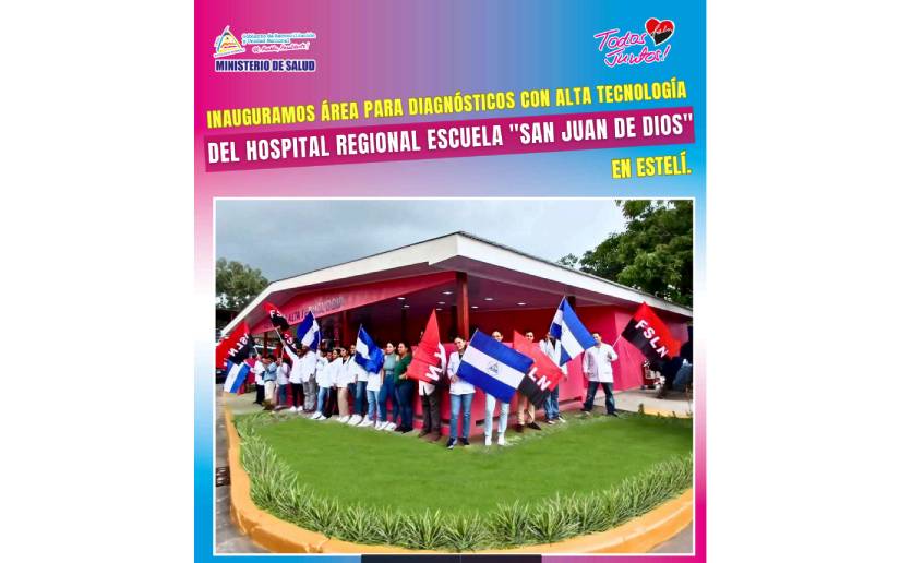 Mañana Jueves, inauguraremos las mejoras en el Área para Diagnóstico con Alta Tecnología del Hospital Regional Escuela “San Juan de Dios” en Estelí, que contará con equipos nuevos, como ecocardiógrafo, electrocardiograma, Holter, mapa de presión arterial y ultrasonidos, para monitorear la presión arterial y realizar estudios del corazón, cerebro, pulmones, abdomen, entre otros órganos, a casi 135 mil pacientes que son atendidos anualmente, en esta Unidad de Salud. Inversión 9.6 millones de córdobas.