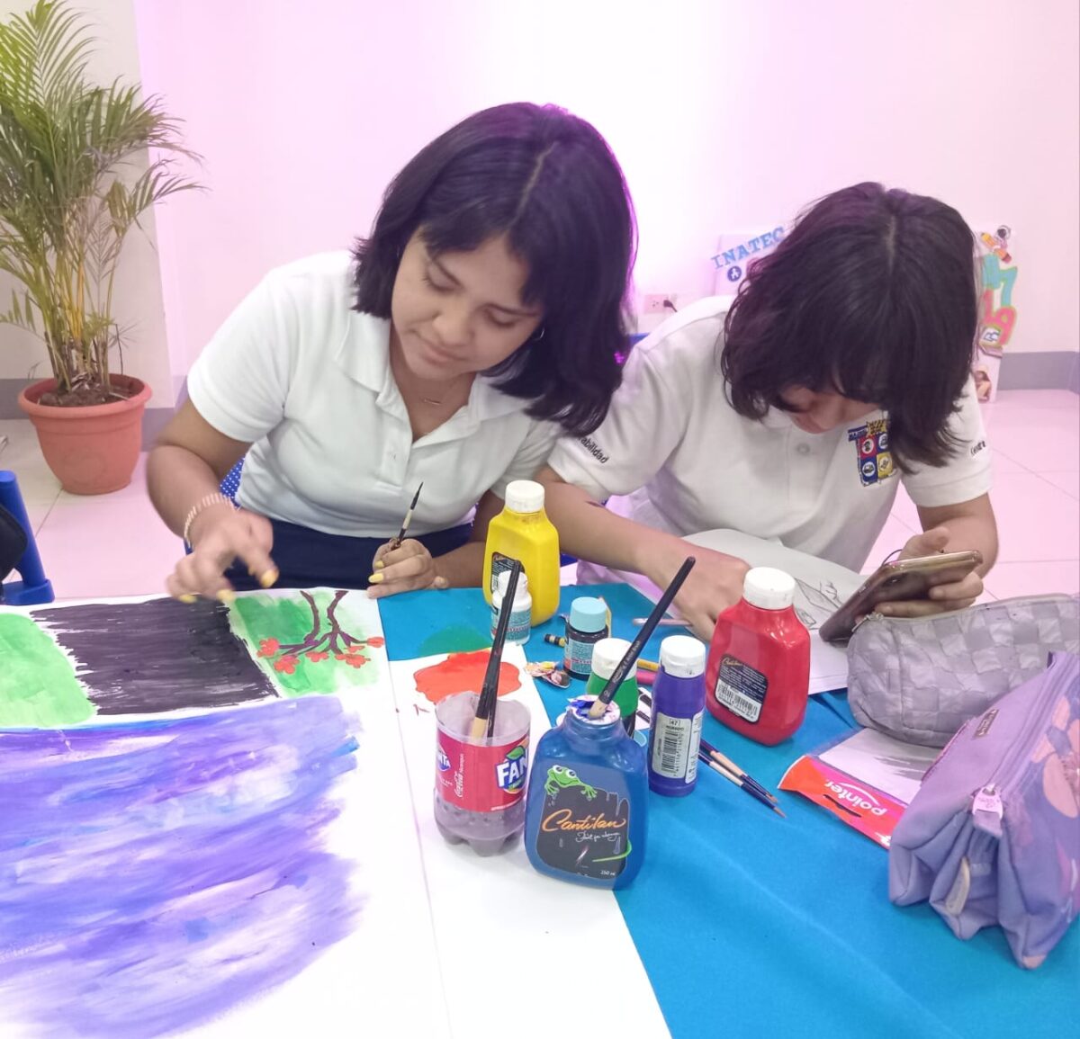 Estudiantes de primer año de Diseño Gráfico y de otras carreras técnicas como Contabilidad y Administración del Instituto Manuel Olivares, participaron este martes en una exposición de dibujos y murales.