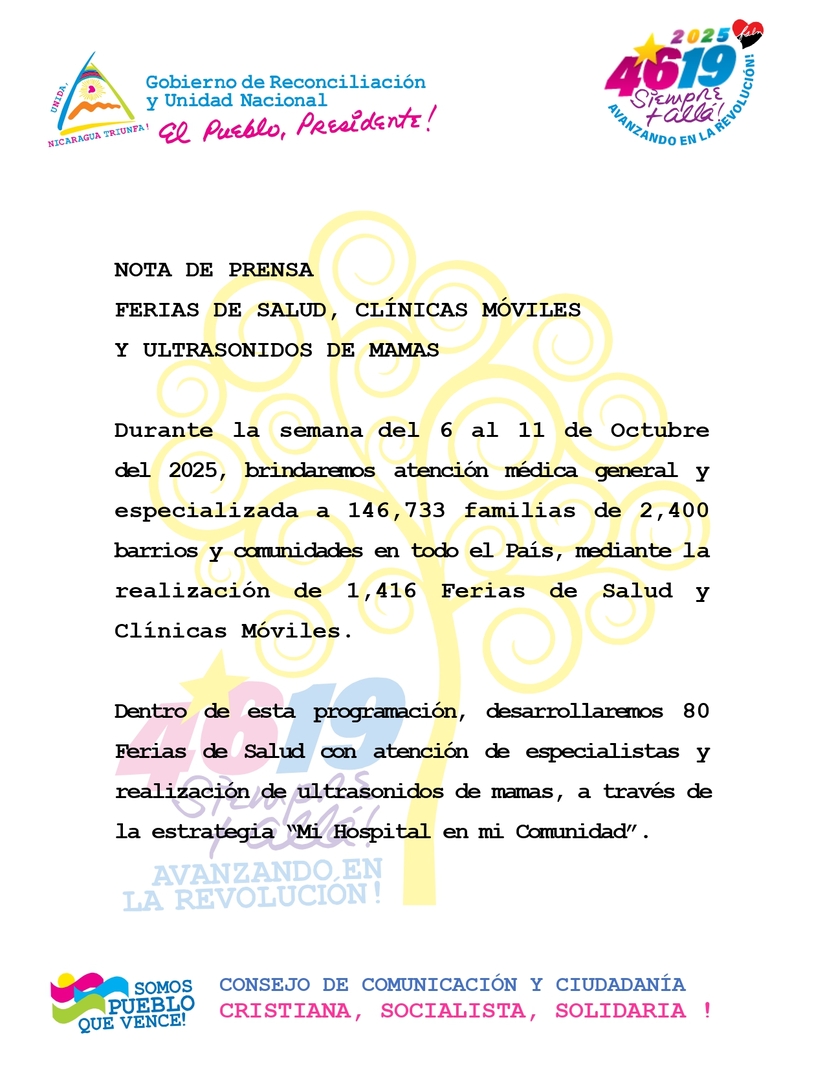 Durante la semana del 6 al 11 de Octubre del 2025, brindaremos atención médica general y especializada a 146,733 familias de 2,400 barrios y comunidades en todo el País, mediante la realización de 1,416 Ferias de Salud y Clínicas Móviles.