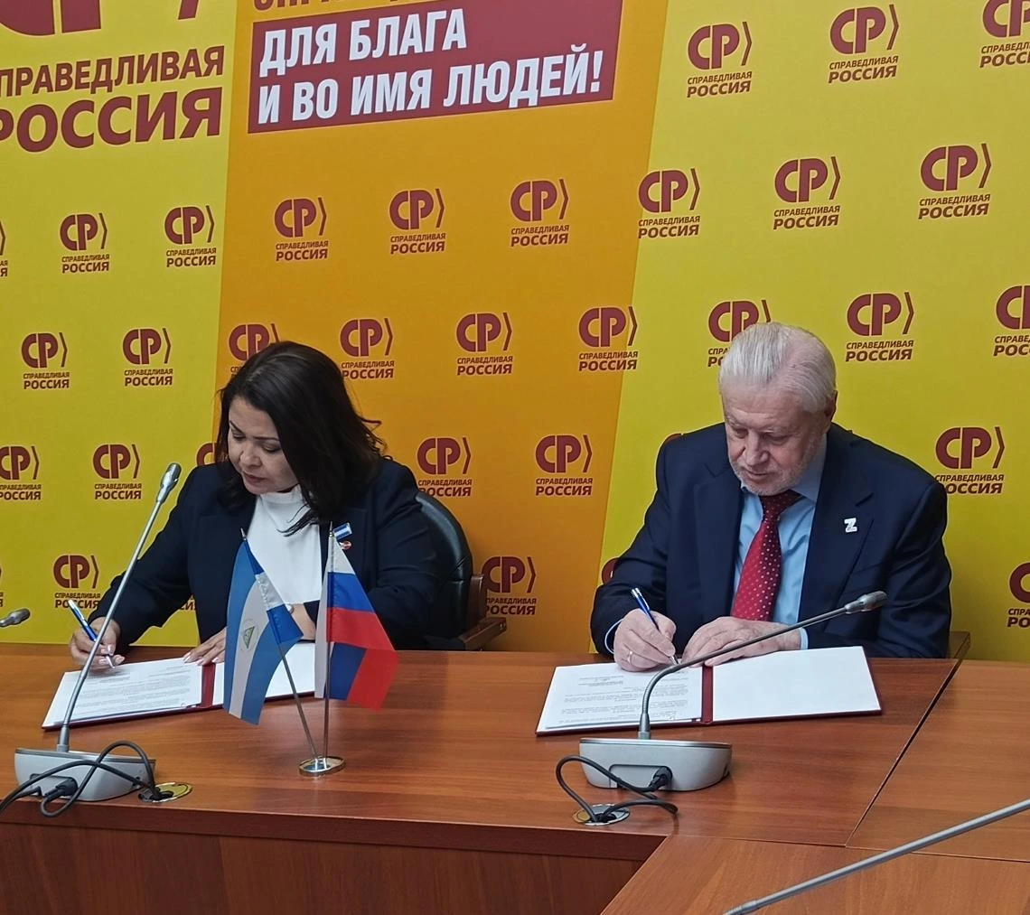 La Compañera Arling Alonso, en representación del Frente Sandinista de Liberación Nacional y el Compañero Sergei Mijáilovich Mirónov, líder del Partido Rusia Justa, Miembro de la Duma Estatal y Jefe de la facción parlamentaria de Rusia Justa, firmaron el Acuerdo Bilateral entre ambos Partidos.