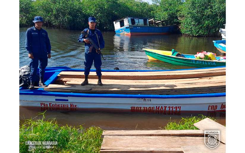 El Ejército de Nicaragua consecuente con el lema de que “Somos el Pueblo mismo uniformado trabajando en su propio beneficio”, del 8 al 10 de septiembre de 2023, a través de sondeos rutinarios del Distrito Naval Caribe, a las embarcaciones que zarpan desde el muelle de la comunidad de Lamlaya, Región Autónoma de la Costa Caribe Norte, ocupó 1,000 pies tablar de madera de la especie Santa María, la que era trasladada de manera ilegal en una embarcación de nombre “Cap. Harly”, con 4 tripulantes a bordo, asimismo, ocupó 1,884 libras de pepino de mar de las especies “Pikachu y Café”, las que se encuentran en período de veda y eran trasladadas de manera ilegal en 3 embarcaciones con 18 tripulantes a bordo, en las coordenadas φ=14º47’00¨N λ=082º38’36¨W, a 30 millas náuticas al noreste de Cayos Miskitos.