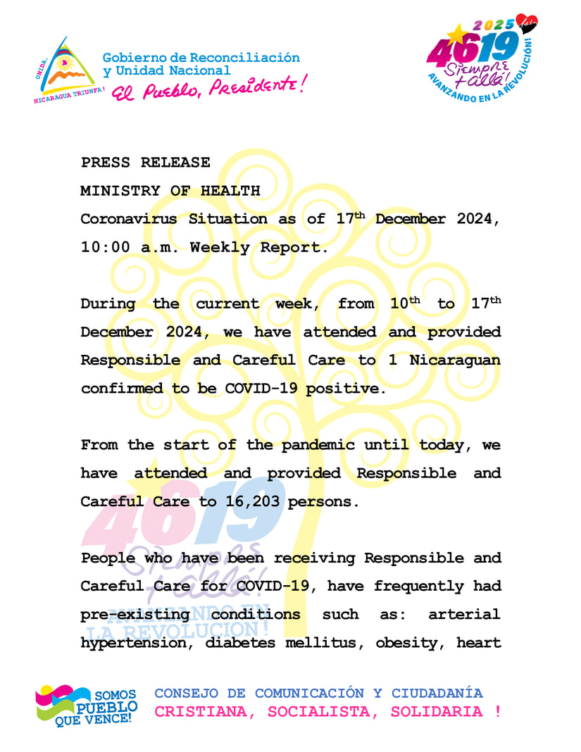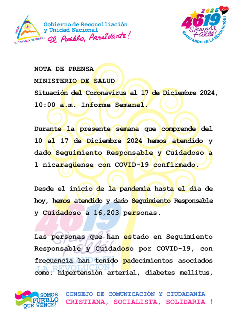 El Ministerio de Salud (MINSA) reporta que durante el periodo del 10 al 17 de diciembre de 2024, ha brindado atención y seguimiento responsable y cuidadoso a un ciudadano nicaragüense con diagnóstico confirmado de COVID-19.