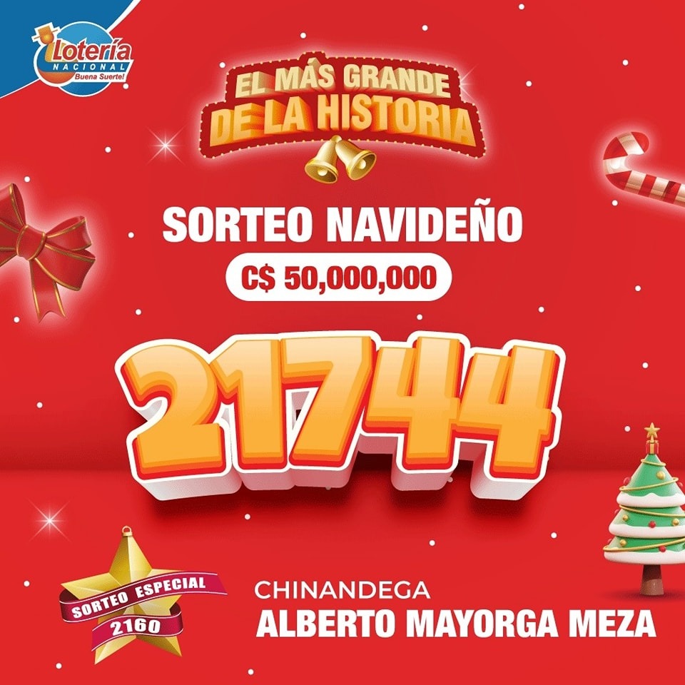 “El billete ganador de los 50 millones de córdobas es el 21744 que se fue al occidente del país en el departamento de Chinandega, vendido por el concesionario Alberto José Mayorga Meza”, anunció Virginia Molina, Gerente General de Lotería Nacional.