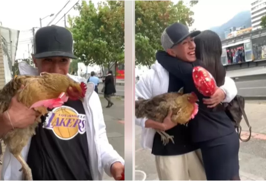 El hombre, obsequió a su novia una gallina que llevaba de adorno un moño en su pecho y un globo en forma de corazón.