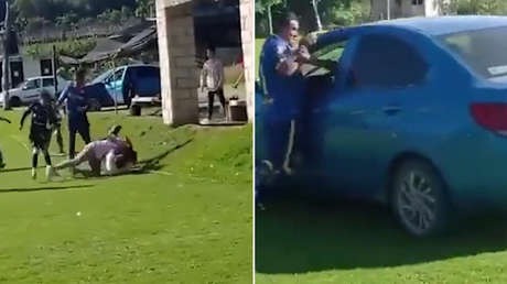 Uno de los jugadores intenta detener al conductor, a través de la ventanilla del vehículo, y posteriormente se le unen otras personas. Sin embargo, el atacante logra liberarse y persiste en su intento de arrollar y burlar a los presentes en el campo, que corrían para huir de su alcance.